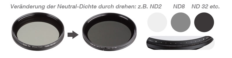 Der Fader ND hat wie ein Polarisationsfilter eine drehbare Frontlinse zur Verstellung der Helligkeit. Bei unseren variablen Graufiltern ist die Frontlinse immer um eine Grösse höher, um dunkel Ränder bei Weitwinkel-Aufnahmen zu verhindern